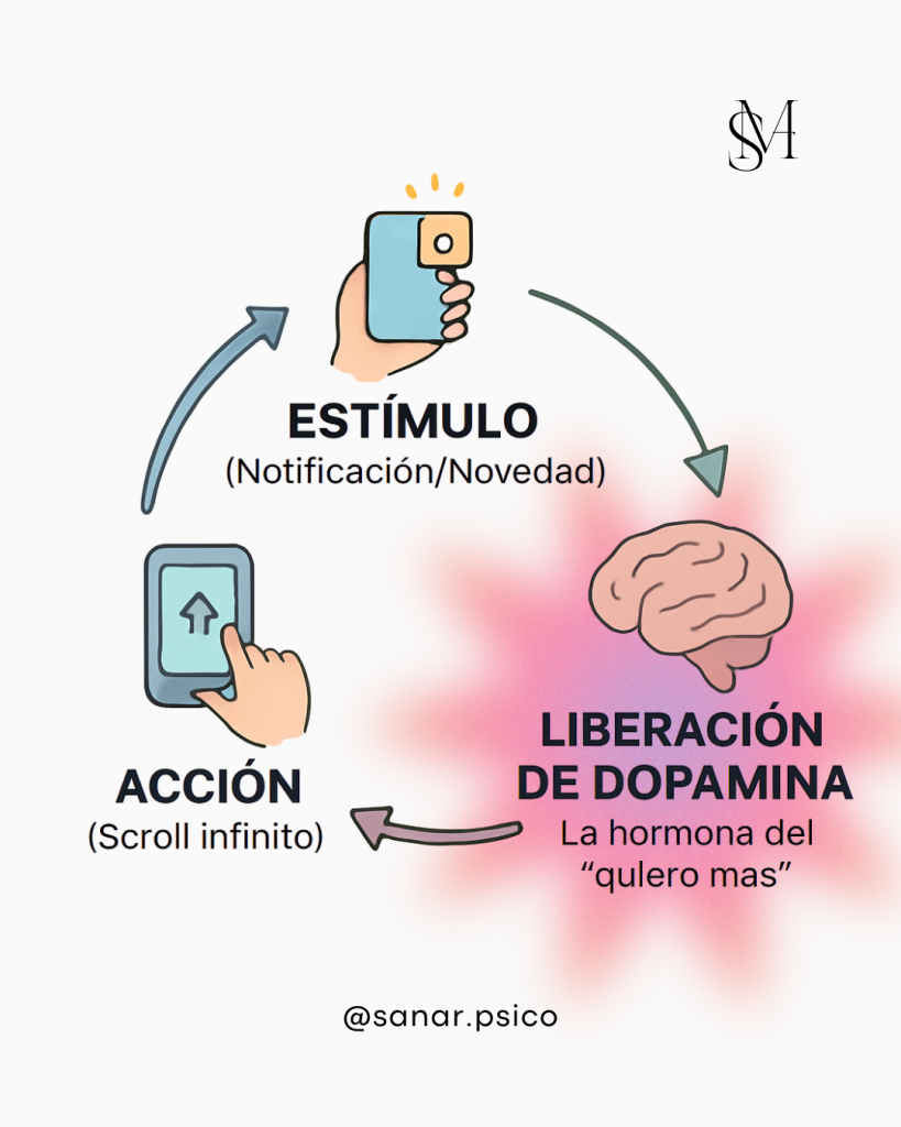 El bucle se inicia con una señal (una notificación). Esta señal nos lleva a anticipar un placer. Cuando haces scroll, no sabes qué vas a encontrar, y esa incertidumbre genera picos de dopamina. El problema es que la dopamina no nos hace sentir saciados; nos impulsa a seguir buscando. Al recibir estas pequeñas recompensas visuales, el cerebro entra en un círculo donde cada vez necesita más tiempo conectado, alimentando la adicción a las pantallas y redes sociales.